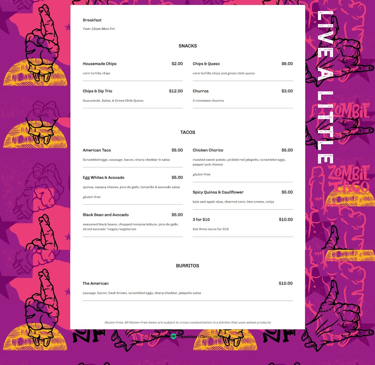 Many patrons have praised the exceptional customer service, highlighting the friendly and accommodating staff, including Jennifer, who enhances the bar experience. The ambiance is bright and inviting, making it a popular spot for both students and tourists alike. Visitors appreciate the affordable pricing paired with quality, making Zombie Taco a must-visit for taco lovers. Whether you’re indulging in a delicious meal or participating in a class with Chef Kevin, Zombie Taco promises unforgettable experiences.